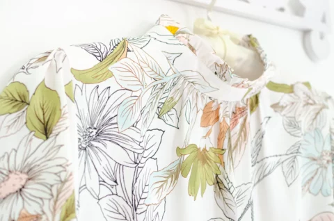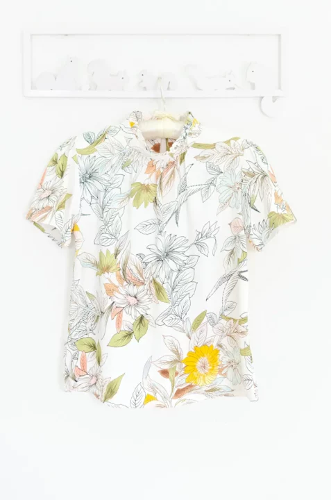 เสื้อคอปิดจับจีบตั้งๆกลับมาแล้วค่า เนื้อผ้าชีฟองพิมพ์ลายดอกไม้ ผ้าทิ้งตัวนิดๆ ตัวผ้าจะยังโปร่งแสงยังแนะนำให้ใส่ซับในนะคะ ใต้คอจับจีบรูดเบาๆโชว์ความพลิ้วสวยของผ้า แขนสั้น ด้านหลังผ่าหยดน้ำติดกระดุม สาวกชีฟองถูกใจแน่นอนค่ะ