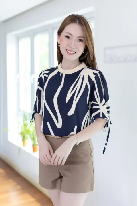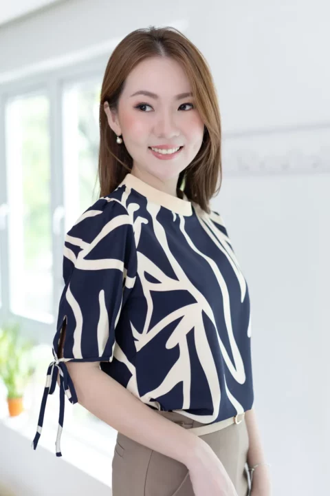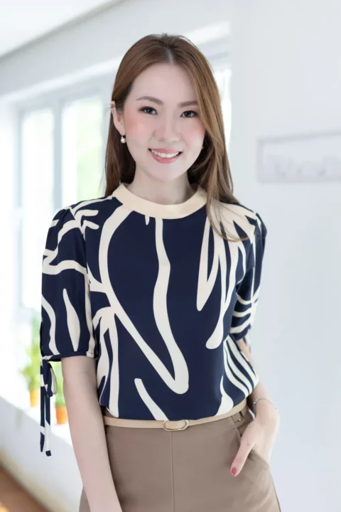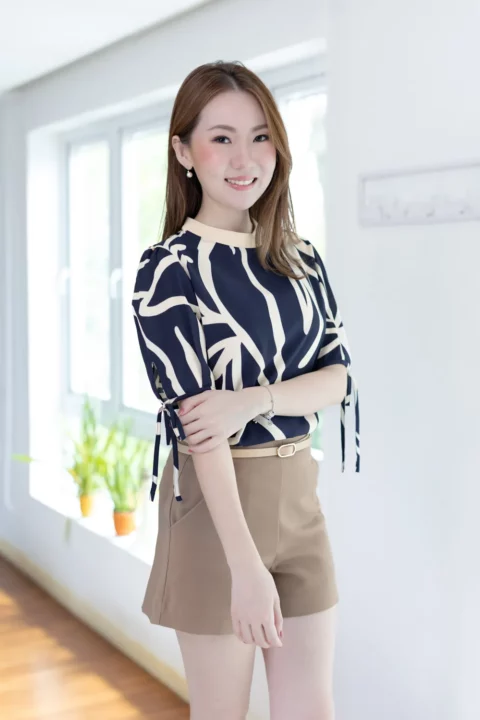 เสื้อแบบเรียบร้อย คอปิด แขนยาวประมาณเหนือศอกแต่งสายผูกโบว์ได้ ด้านหลังคอผ่าหยดน้ำติดกระดุม เรียบง่าย สวมใส่ง่าย ขอแนะนำนะคะ
