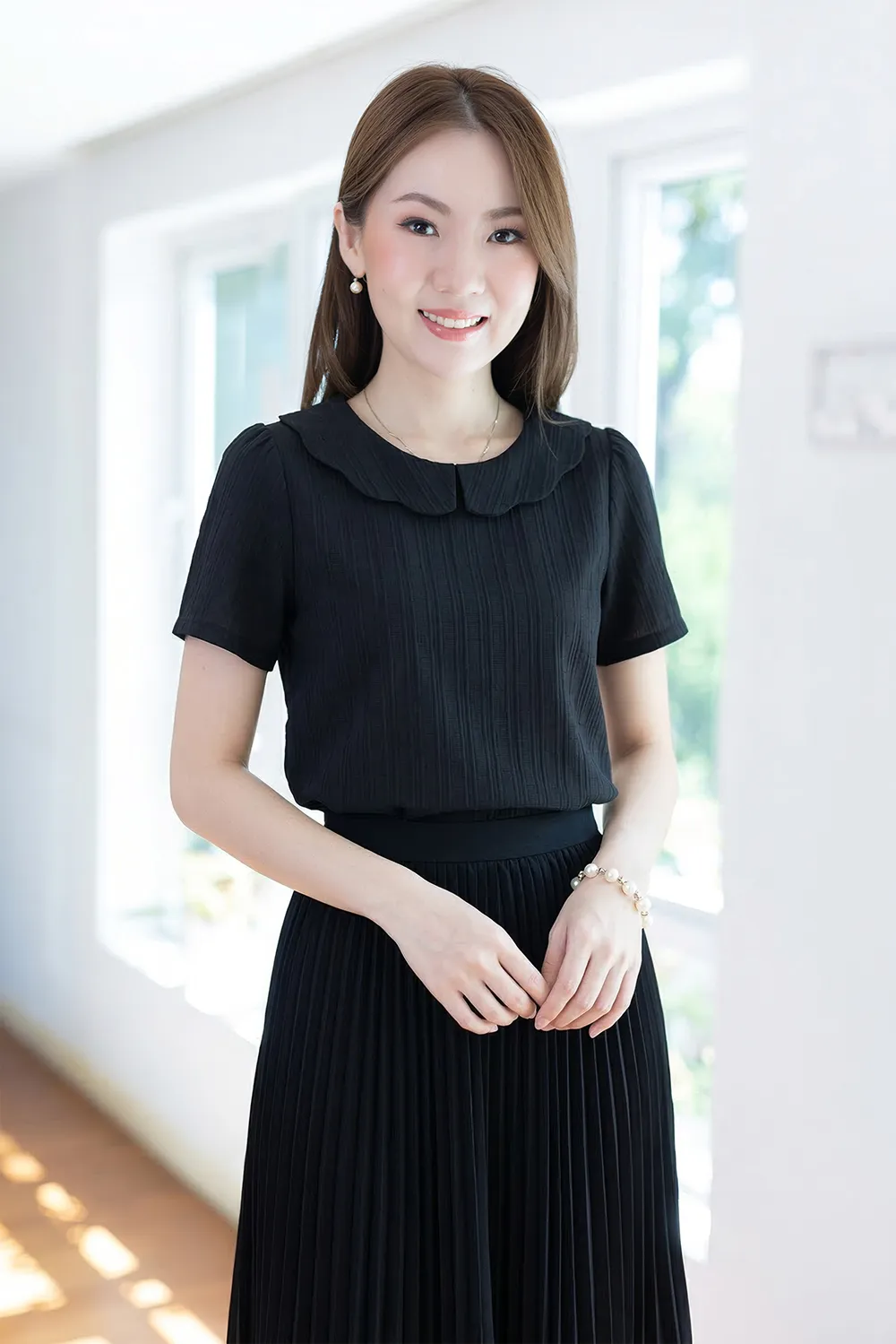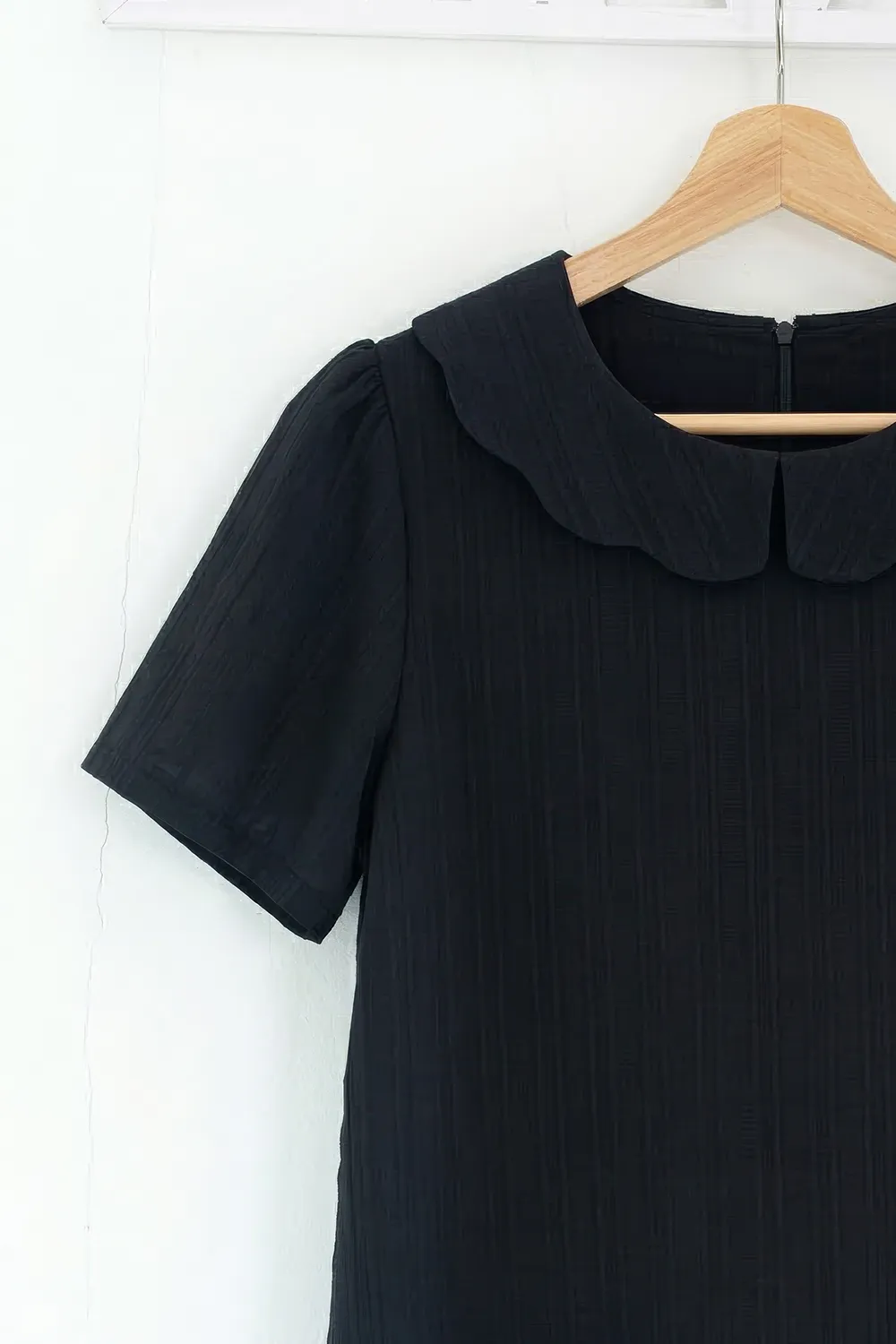 เสื้อคอกลม แขนสั้นสุดสบาย แต่งปกทรง Scallop ขอบคลื่นหยักๆ ผ่าหยดน้ำหลังสวมใส่ง่ายเหมือนเดิม เนื้อผ้าอัดย่นเป็น Texture ลายริ้วยาวลงมา ด้านหลังผ่าหยดน้ำติดกระดุม ทรงคอดใต้อกนิดๆดูเข้ารูปขึ้น
