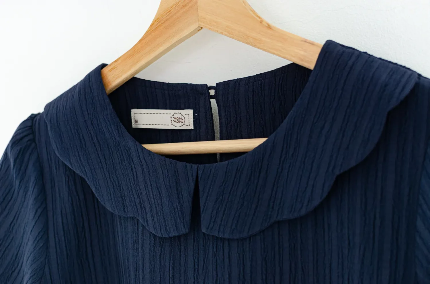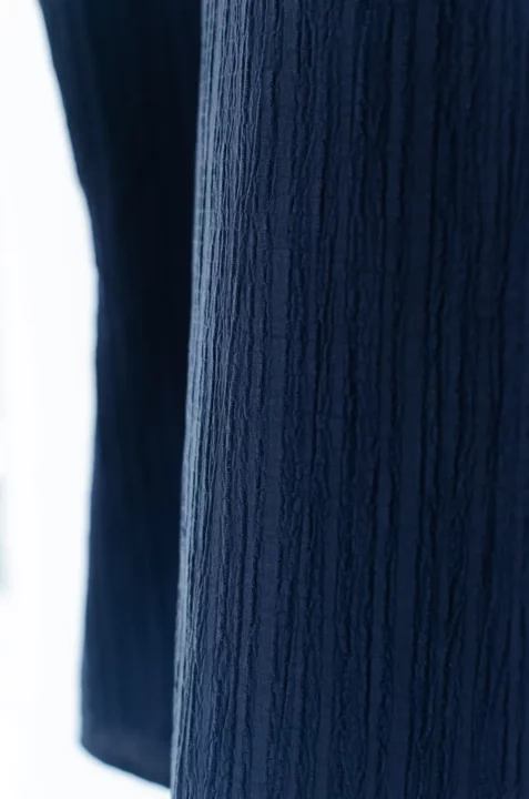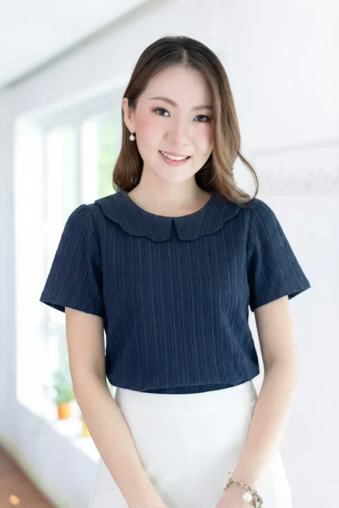 เสื้อคอกลม แขนสั้นสุดสบาย แต่งปกทรง Scallop ขอบคลื่นหยักๆ ผ่าหยดน้ำหลังสวมใส่ง่ายเหมือนเดิม เนื้อผ้าอัดย่นเป็น Texture ลายริ้วยาวลงมา ด้านหลังผ่าหยดน้ำติดกระดุม ทรงคอดใต้อกนิดๆดูเข้ารูปขึ้น