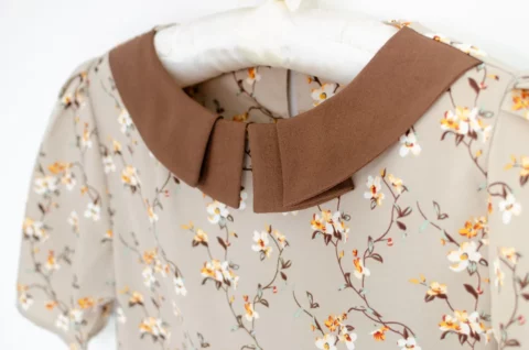 เสื้อทรงคอกลมปาด ด้านหน้าแต่งปกสีพื้น ดีเทลพับซ้อนดูเรียบร้อยแต่ไม่น่าเบื่อ แขนสั้นกำลังดี ใช้ผ้าพิมพ์ลายดอกไม้เล็กๆหวานๆ เนื้อผ้าไหมอิตาลีผิวนวลเนียน ผ้าไม่หนาใส่สบาย ด้านหลังคอผ่าหยดน้ำสั้นๆ