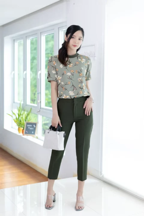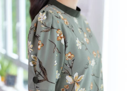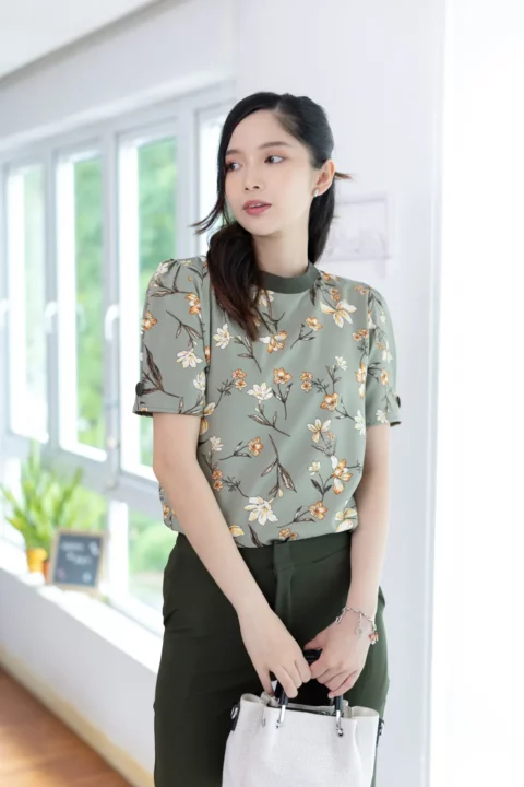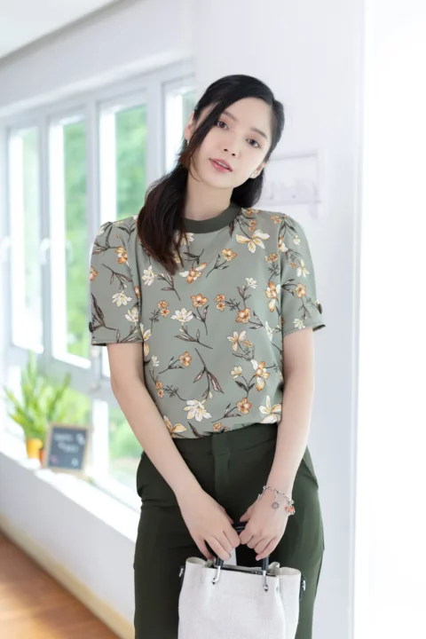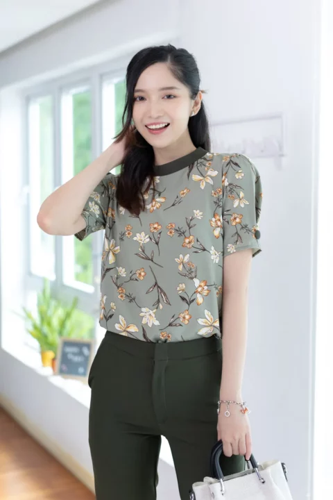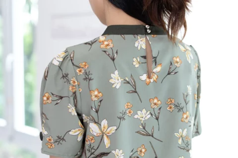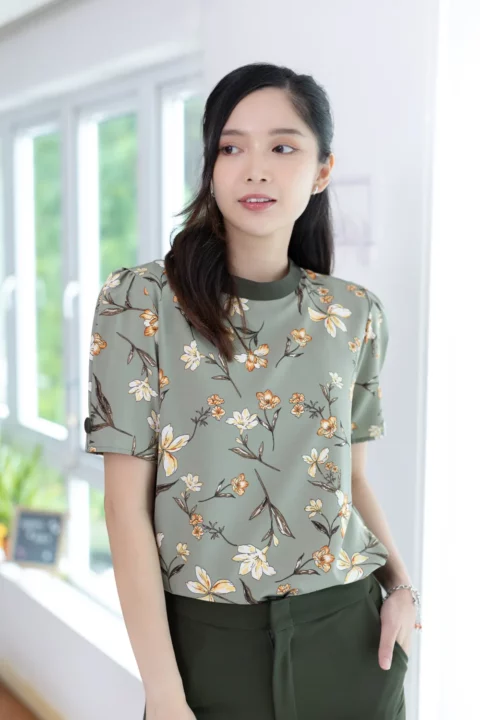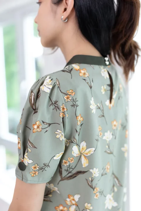 เสื้อทรงเก๋แบบไม่เอะอะ ตัวเสื้อใช้ไหมอิตาลี เนียน สบายผิว พิมพ์ลายดอกไม้ ขอบคอใช้ผ้าสีพื้นตัดสีเน้นลายเสื้อให้ดูโดดเด่น ปลายแขนจับจีบแต่งกระดุมปั๊ม เจาะหยดน้ำติดกระดุมหลังคอ ช่วงตัวคอดใต้อกเล็กน้อย ทรงสวยใส่ง่าย