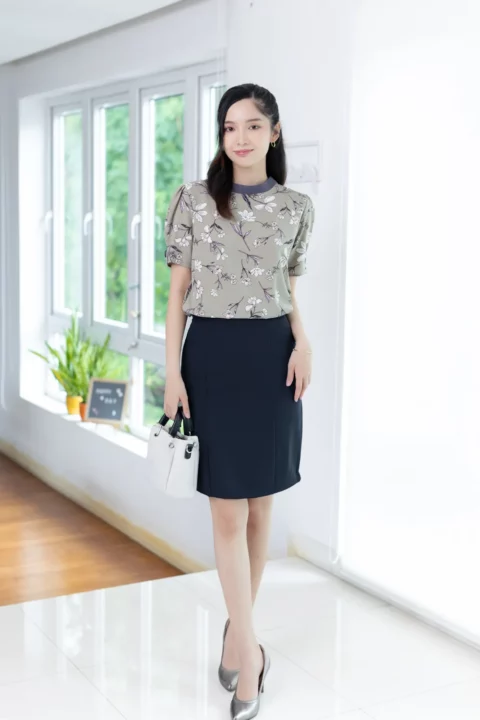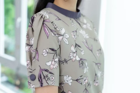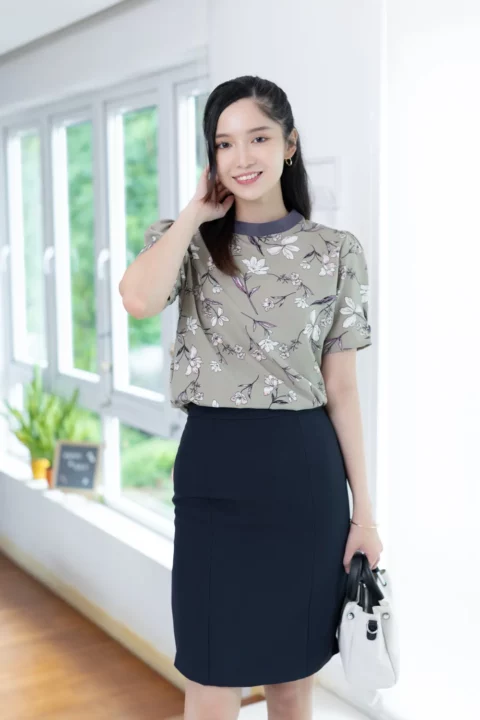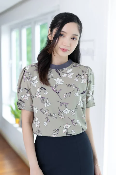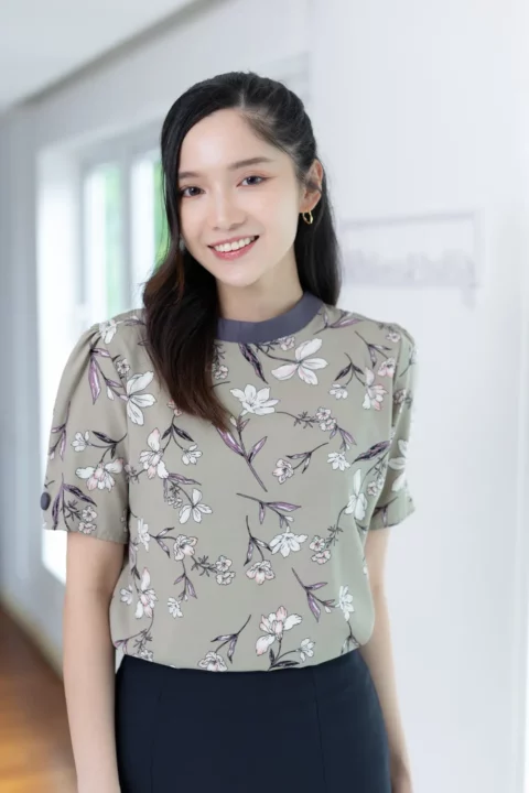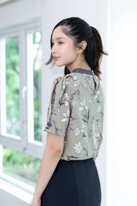 เสื้อทรงเก๋แบบไม่เอะอะ ตัวเสื้อใช้ไหมอิตาลี เนียน สบายผิว พิมพ์ลายดอกไม้ ขอบคอใช้ผ้าสีพื้นตัดสีเน้นลายเสื้อให้ดูโดดเด่น ปลายแขนจับจีบแต่งกระดุมปั๊ม เจาะหยดน้ำติดกระดุมหลังคอ ช่วงตัวคอดใต้อกเล็กน้อย ทรงสวยใส่ง่าย