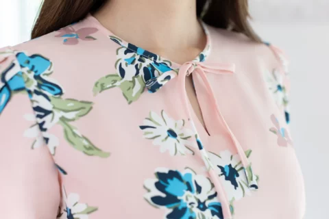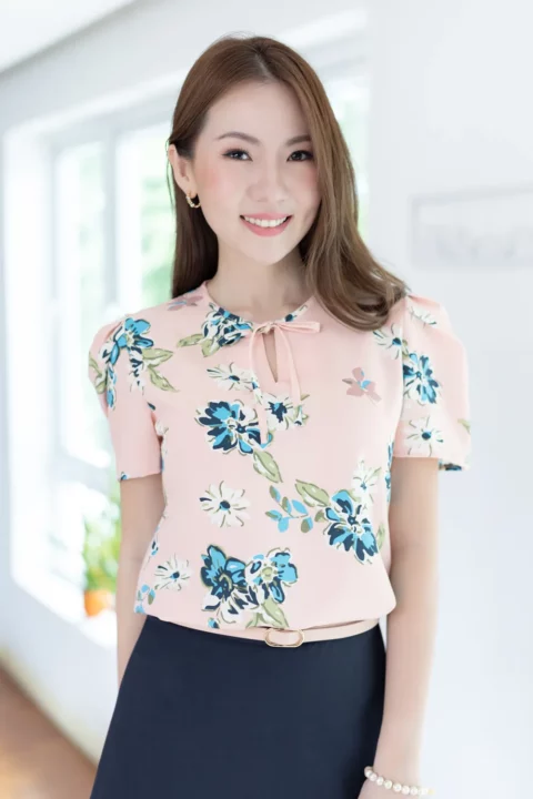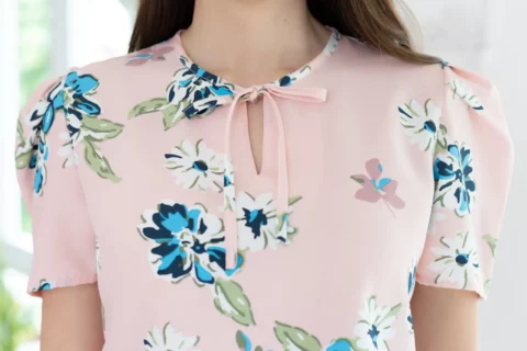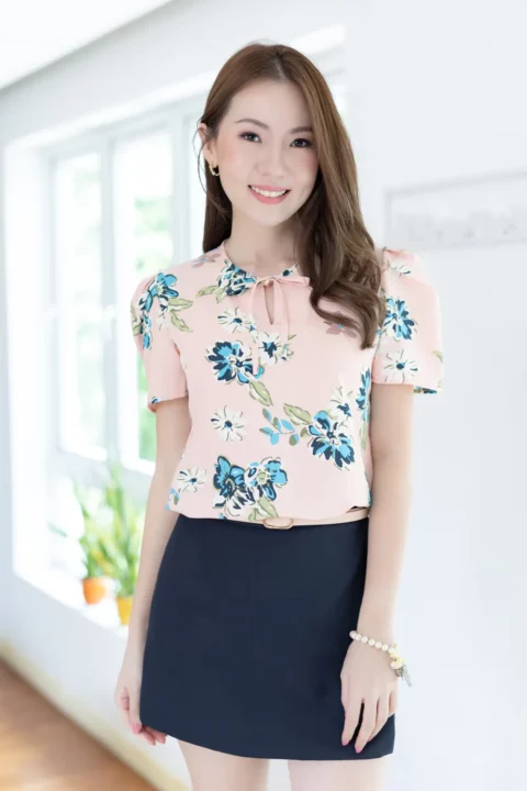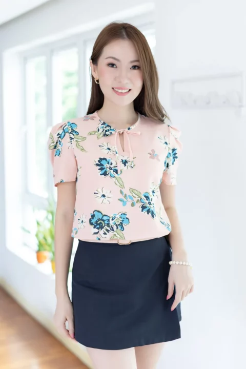 เสื้อทรงสบายใส่ง่ายและงาม คอกลมผ่าสามเหลี่ยมด้านหน้าสั้นๆ กุ๊นรอบคอสายยาวไว้ผูกเป็นโบว์ แขนสั้นต้นแขนจับจีบยกพองนิดๆ ลุคดูหวานเก๋ ช่วงตัวคอดใต้อกเล็กน้อย ทรงสวย ผ้าเนื้อเนียน ดีงาม