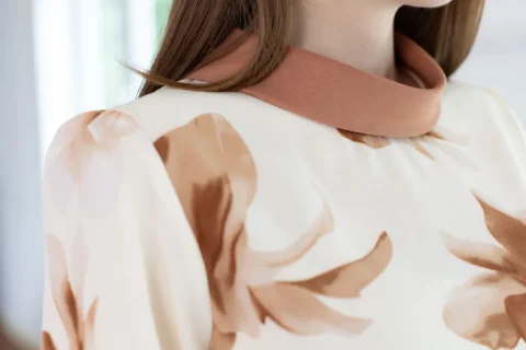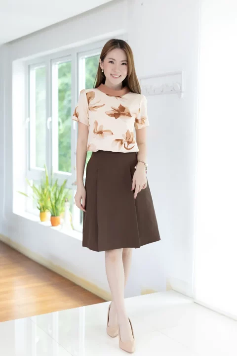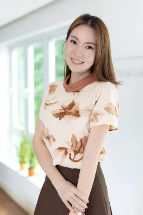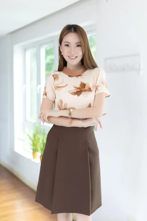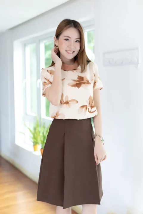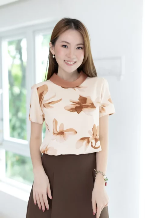 NT2488 Folded Collar Floral Blouse – Cream-Brown