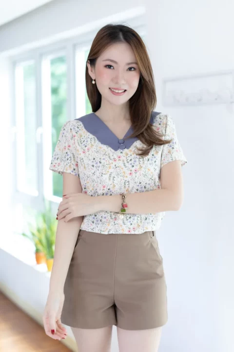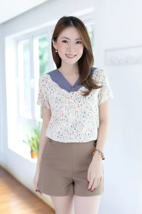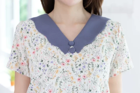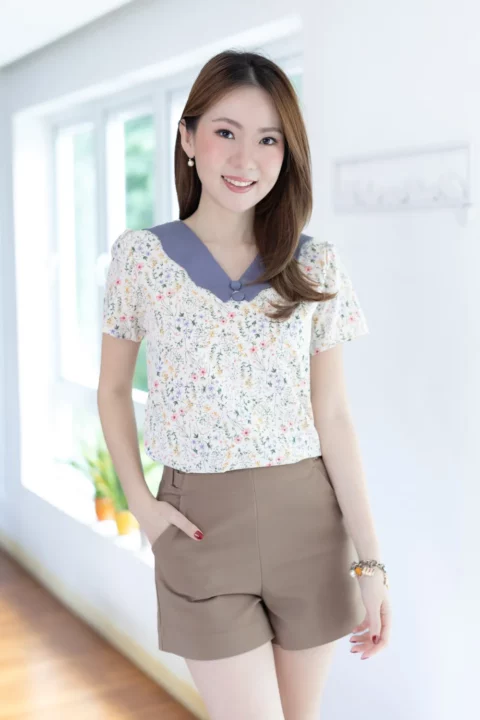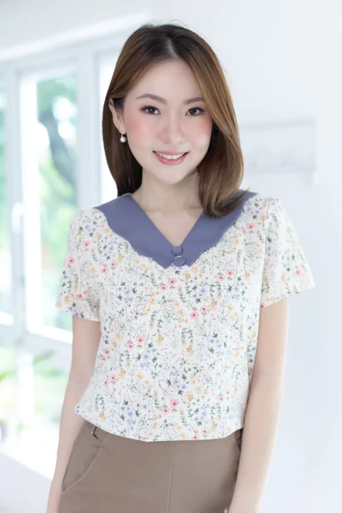 เสื้อแต่งปกทรง Scallop ที่น่ารักที่สุดในขณะนี้ ขอยกให้คนนี้เลย เป็นปกบัวปลายแหลมขอบคลื่นหยัก แต่งกระดุมปั๊มด้านหน้า 2 เม็ด ผ้าพิมพ์ลายดอกไม้ ตัดด้วยสีพื้น แขนสั้น ผ่าหยดน้ำหลังสวมใส่ง่ายเหมือนเดิมค่า คอดใต้อกนิดๆ ทรงไม่ใหญ่ค่ะ