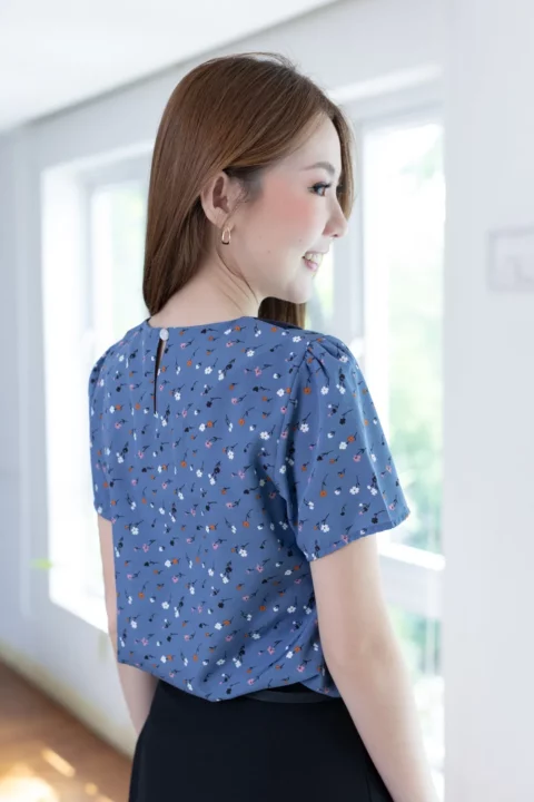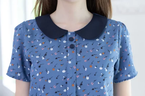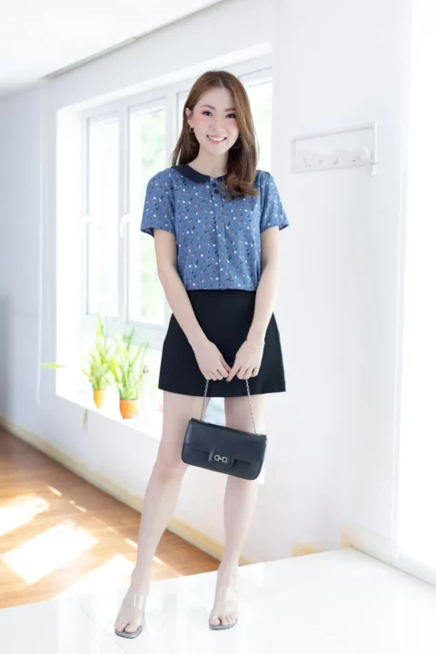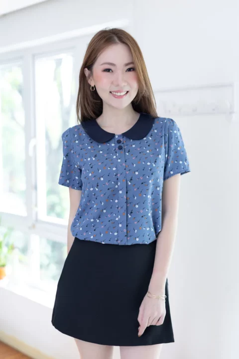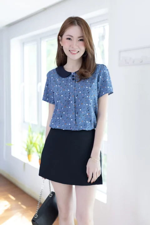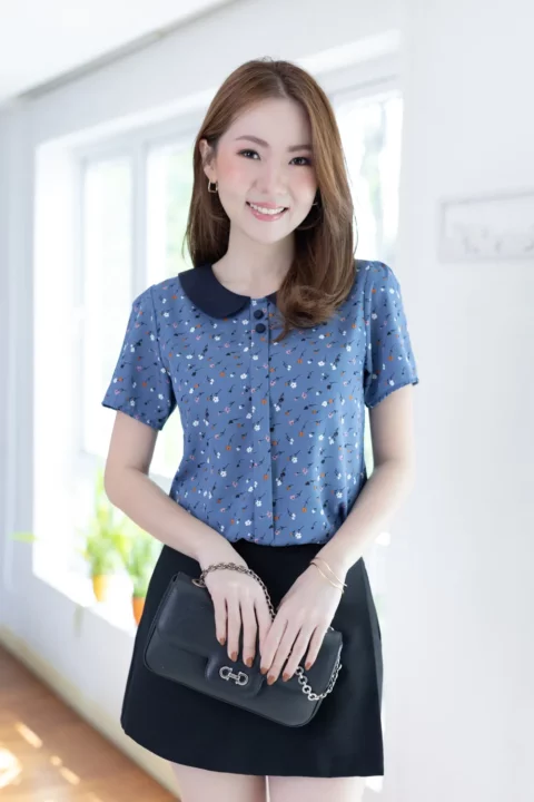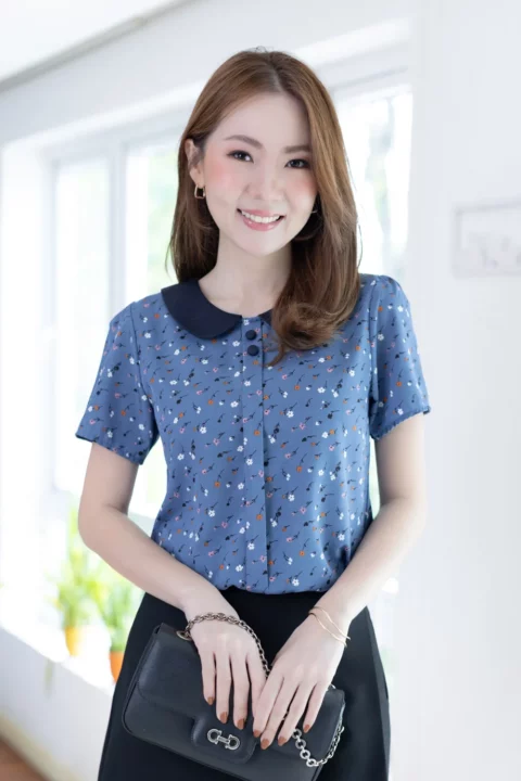 เสื้อปกบัว แต่งสาบหลอกด้านหน้ายาวพร้อมกระดุมปั๊มคู่สีเข้ากันกับปก แขนสั้นใส่ง่าย ทรงแมทช์ง่ายมากค่า ตัวเสื้อเป็นผ้าไหมอิตาลีเนื้อเนียน ยับยาก รีดง่าย ดูแลง่ายค่ะ