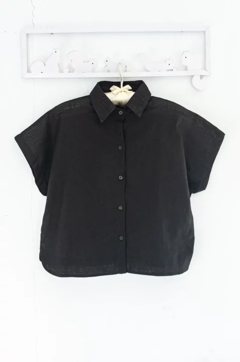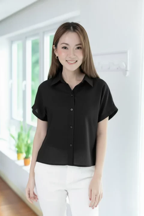 ✨🌘 เชิ้ตแขนค้างคาวสั้น ทรงเสื้อสั้นใส่ปล่อยชายเสื้อได้เลย ด้านหลังเสื้อเล่นคัตติ้งตะเข็บตรงกลาง สีพื้น เรียบง่าย คลาสสิค