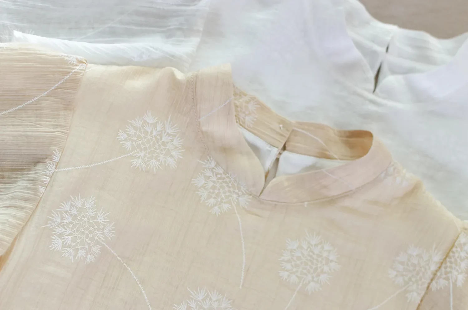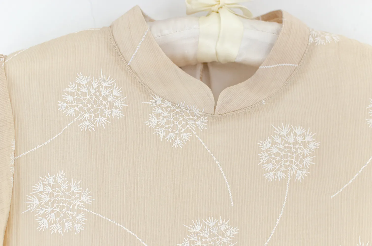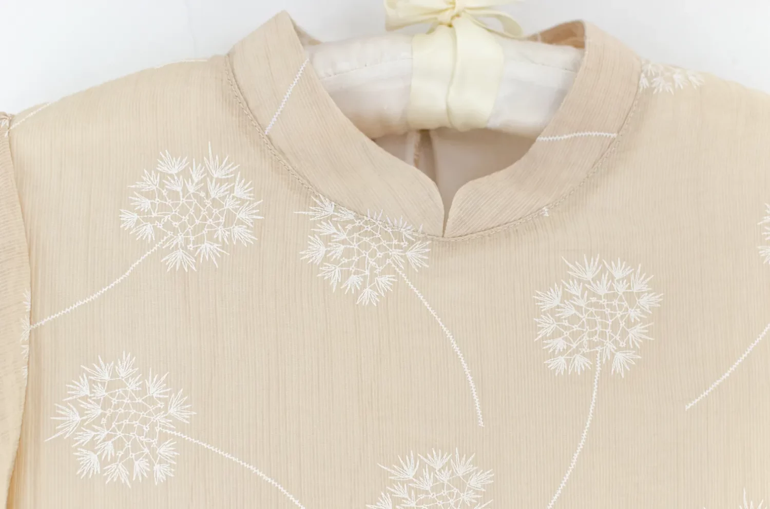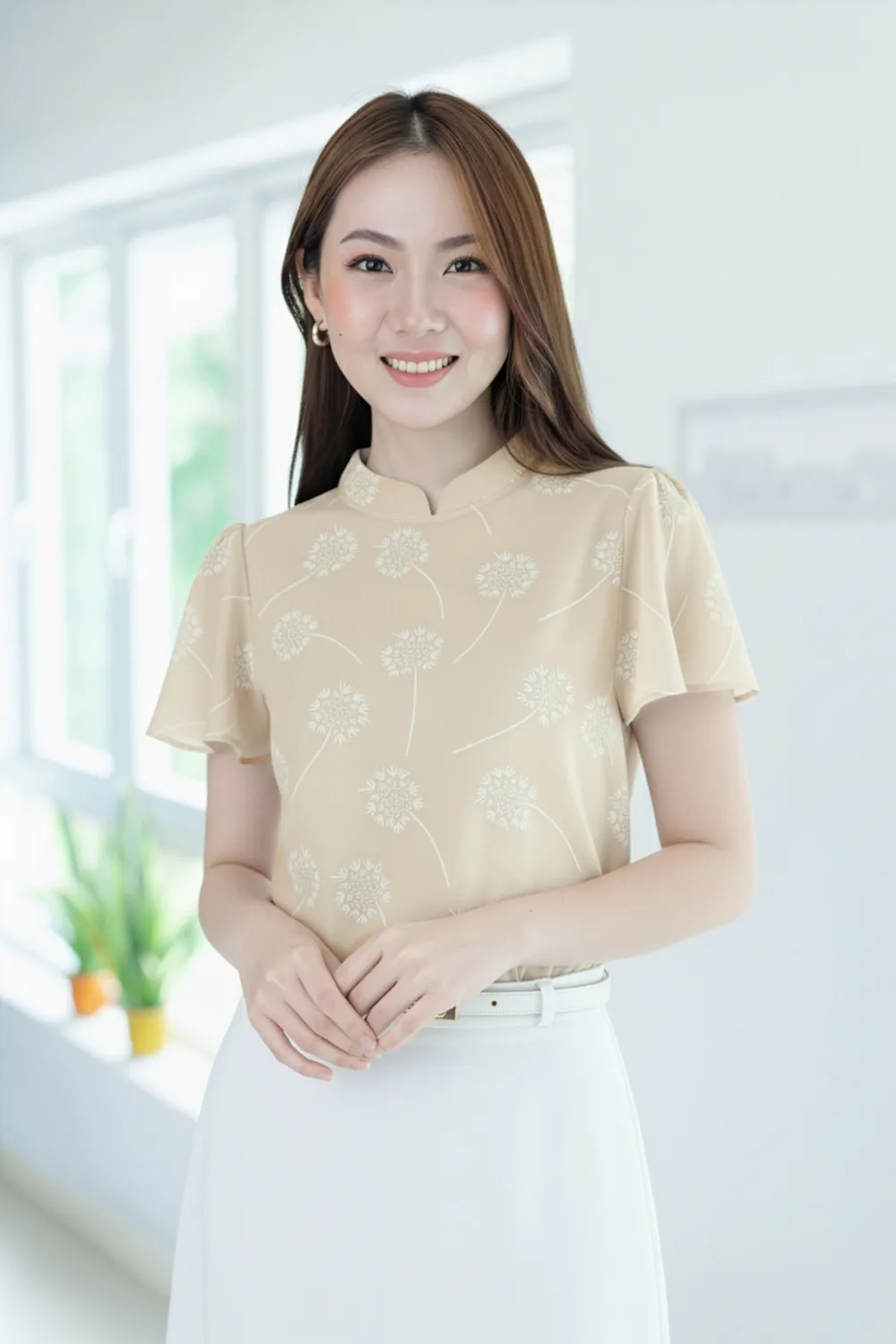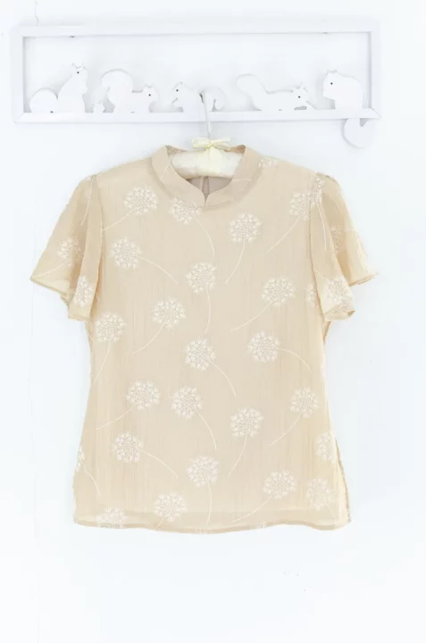 เสื้อสวยๆนุ่มๆนวลๆ ทรงคอจีน แขนผีเสื้อสั้น มีซับในช่วงตัวทั้งด้านหน้าและหลัง ทรงเสื้อคอดเข้ารูปสวมใส่แล้วดูพอดีตัวมากขึ้น ตัดเย็บด้วยเนื้อผ้าโปร่งอัดย่นลายเปลือกไม้ พร้อมดีเทลพิเศษสกรีนลายดอกไม้บนผิวผ้า ลุคนี้ดูฟุ้งๆ หวานๆ คลาสสิคยาวนาน