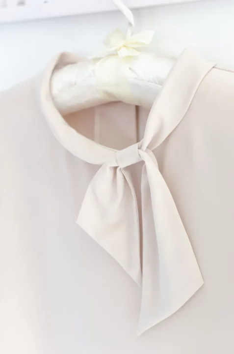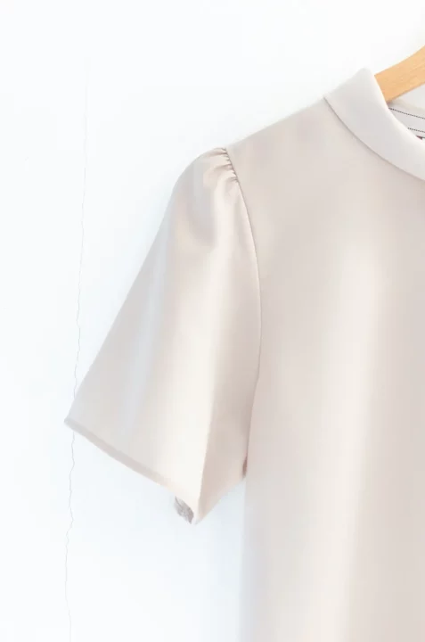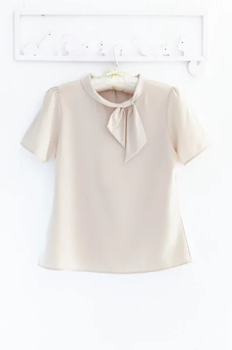 เสื้อทรงสุภาพ สีนุ่มนวลสบายตา ทรงคอม้วนแบบเบาๆ แต่งสายสั้นสามารถถอดแยกออกได้ เมื่อสอดเข้ามาจะเป็นทรงโบว์ เป็นทรงแขนสั้น ที่ใส่ง่ายดูแลยง่าย ทรงเสื้อคอดเข้ารูปนิดๆช่วงใต้อก สวมใส่แล้วอาจรู้สึกพอดีตัวมากกว่าปกติ