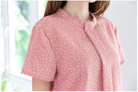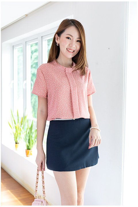 เสื้อแขนสั้น ผ้าโพลีเอสเตอร์เนื้อดี ทิ้งตัวสวย ไม่พอง คอปิด แต่งสาบหลอกด้านหน้ายาวๆ ผ่าหยดน้ำ ติดกระดุมด้านหลัง พิมพ์ลายจุดทั่วตัว ดีไซน์สวย ใส่เรียบร้อยๆ แนะนำสำหรับสาวออฟฟิศเลยค่า