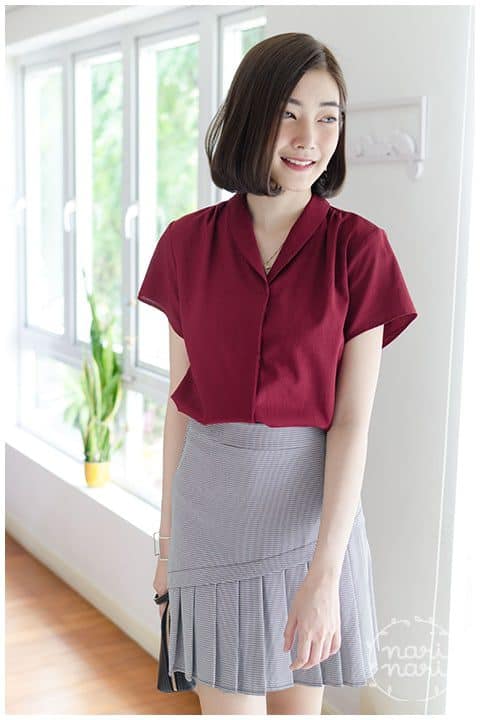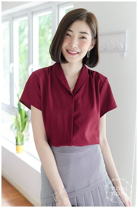 เสื้อแขนสั้น ผ่ากระดุมซ่อนด้านหน้า คอวี พับปกบัวโค้งๆ เล็กๆ น่ารัก จีบช่วงไหล่เพิ่มดีเทล ด้านหลังจับจีบรูดนิดๆด้วยที่คอ สีสวย ใส่ทำงานได้เรียบร้อยๆเลย