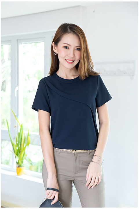 เสื้อแขนสั้น ผ้าดี สีสุภาพ คอกลมแคบๆ แต่งผ้าระบายพาดเฉียงๆ ด้านหน้าช่วงบน ทรงเก๋สวยงาม