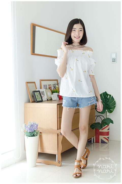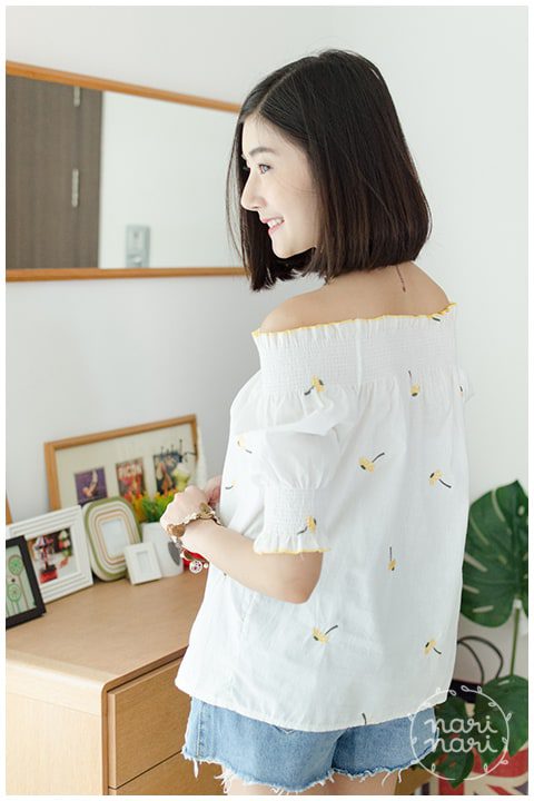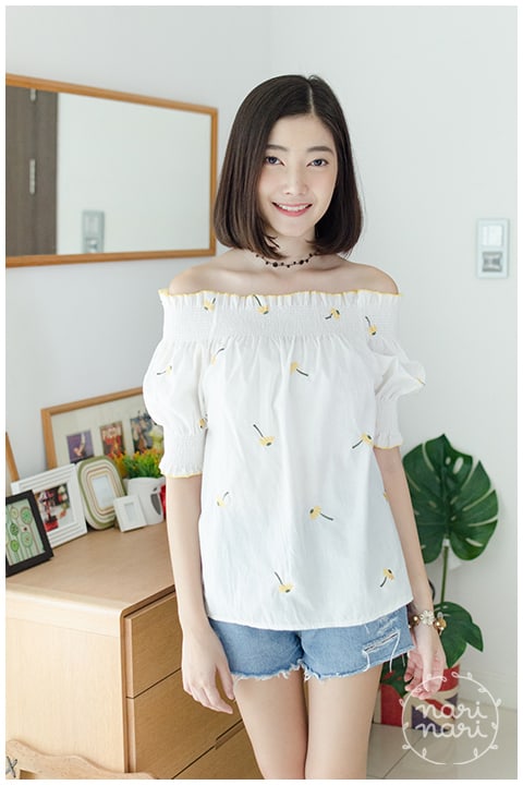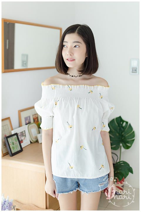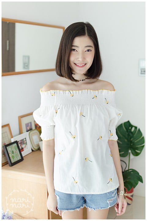 เสื้อเปิดไหล่ปักลายน่ารัก สม็อกไหล่ และรอบปลายแขน ตัวนี้เป็นผ้าคอตตอนสีขาว ปักลายดอกเดซี่สีเหลือง ดูสดใส ใส่ไปเที่ยวนี่น่ารักที่สุดเลย ขอบอก