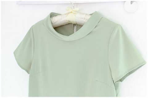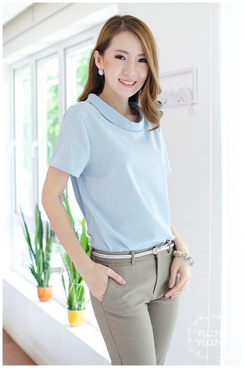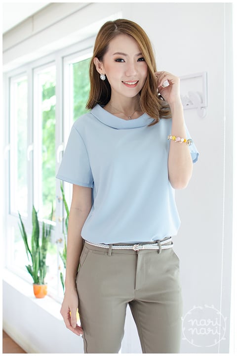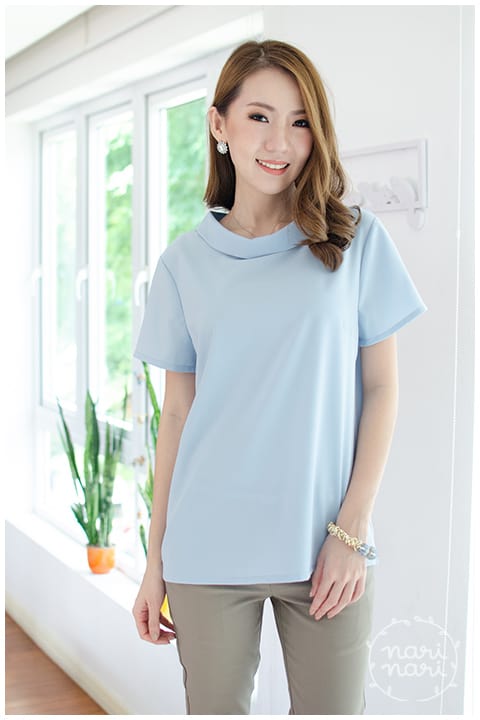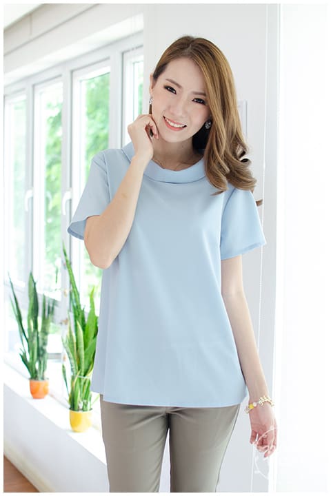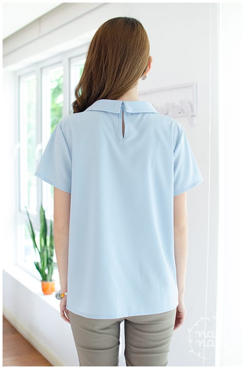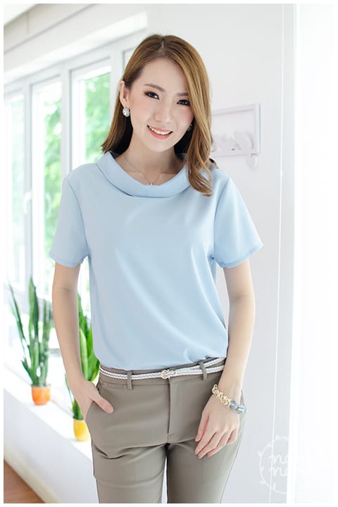 เสื้อแขนสั้น ทรงสวย ดีไซน์คอม้วน ด้านหลังปกแหลม ผ่าหยดน้ำ ติดกระดุมปั๊มแบนๆ ผ้าโพลีเอสเตอร์ผสม เนื้อนิ่ม ทรงคลาสสิกใส่ได้ตลอดกาลเลย