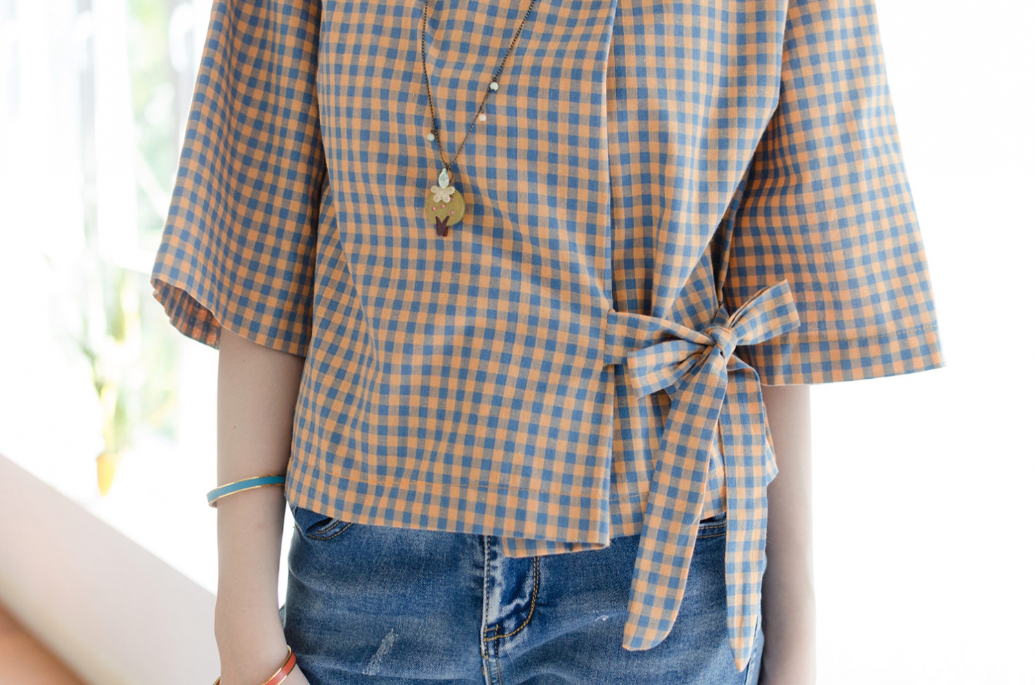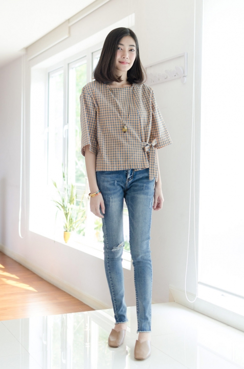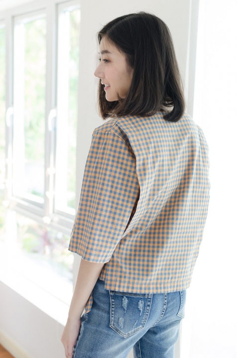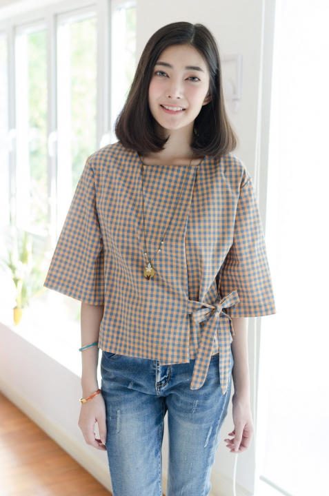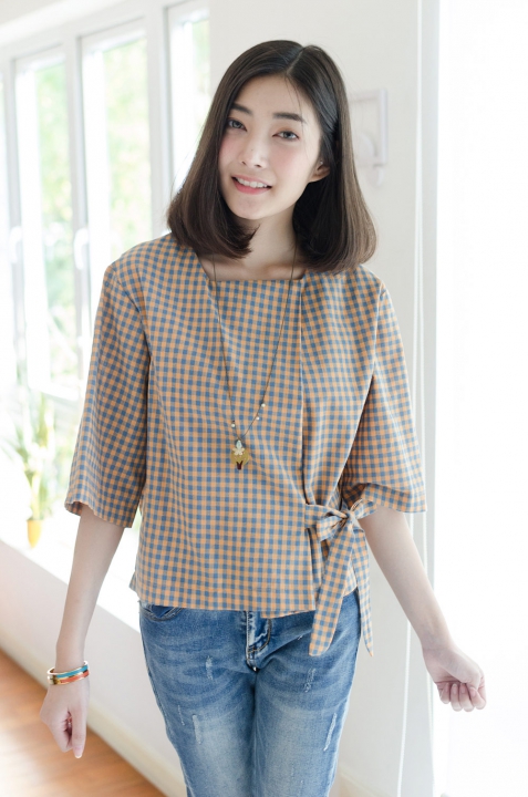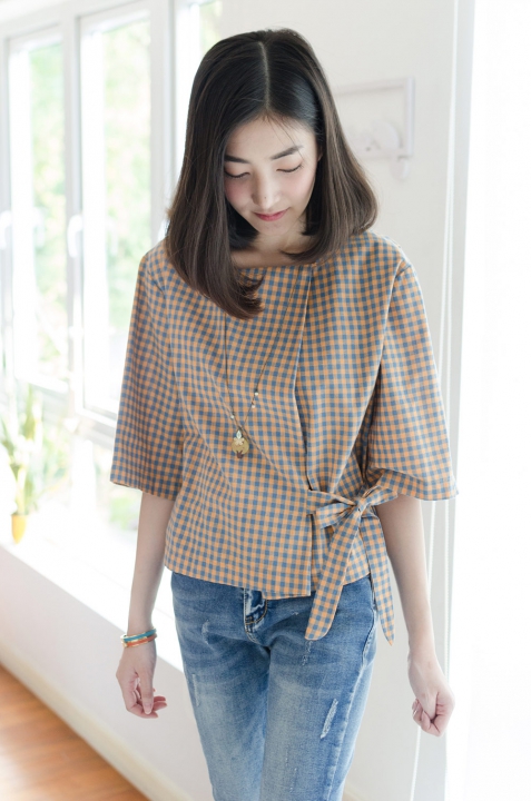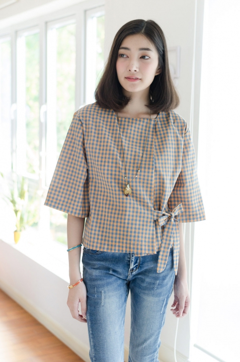 เสื้อคอตตอน ทรงสบายๆ แต่เก๋มาก ดีไซน์คอเหลี่ยม แขนยาวสามส่วน ด้านหน้าทบผ้าซ้อนกัน มีสายโบว์ไว้ผูกด้านข้าง ด้านหลังตีเกล็ด 2 ข้าง สวยไม่เหมือนใครค่า ใช้ผ้าคอตตอนเนื้อหนา ทอลายตารางสีส้มสลับฟ้า น่ารักมาก สดใสเลยค่า