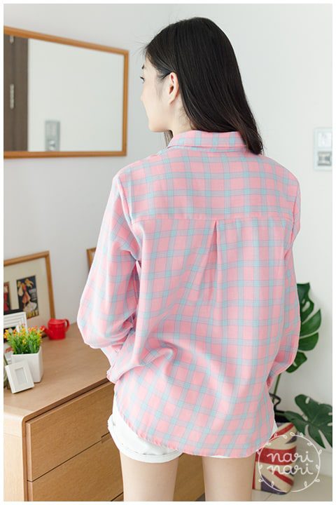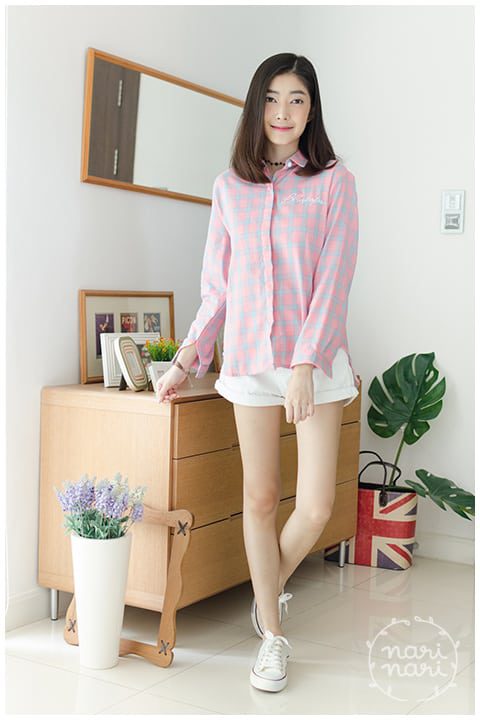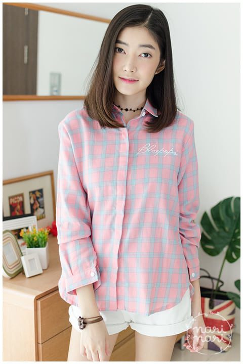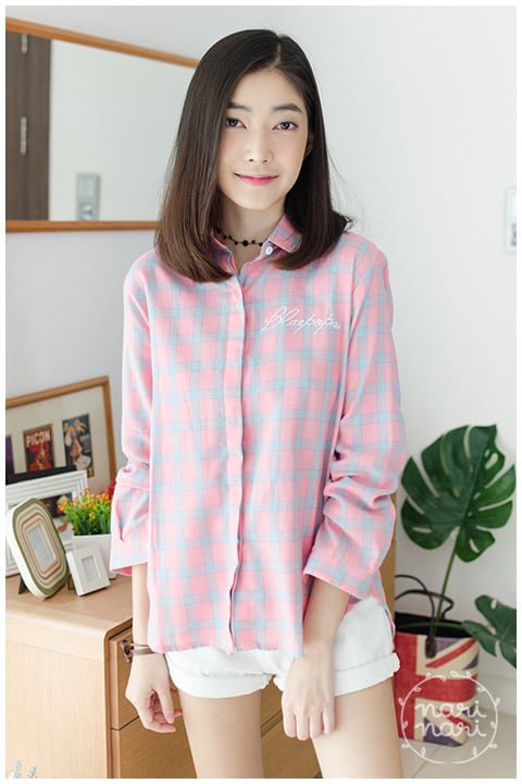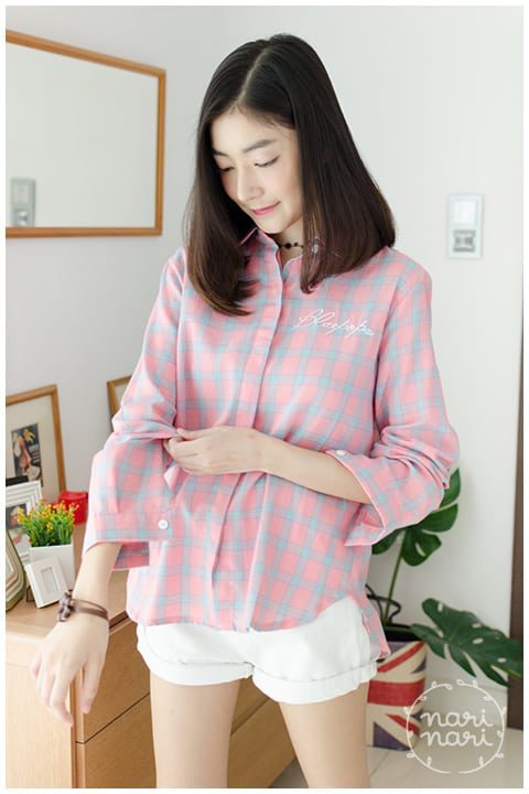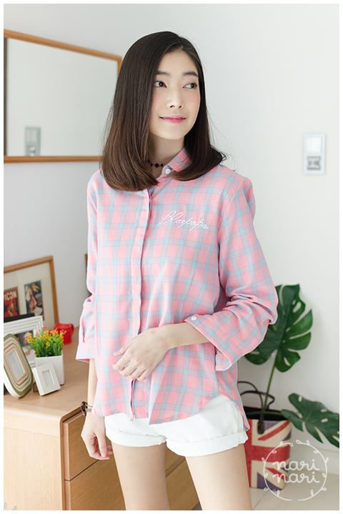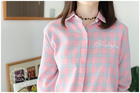 เสื้อเชิ้ต Flannel เนื้อนุ่ม ลายตาราง โทนสีฟลามิงโก โอลด์โรส สดใสๆ คอปก ผ่ากระดุมซ่อนด้านหน้า แขนยาว ปักตัวอักษรที่อก น่ารัก ใส่แล้วอารมณ์ดี๊ดี