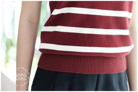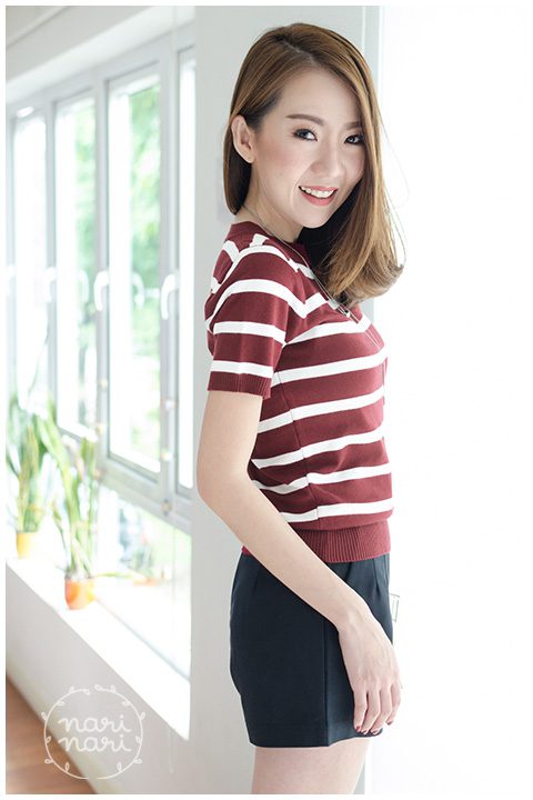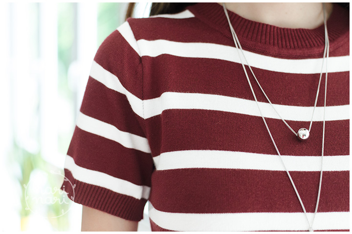 เสื้อไหมพรมเนื้อนิ่ม ทอลายริ้ว สีแดงเลือดหมูสลับสีขาว คอกลม แขนสั้น แบบคลาสสิก ใส่ได้ตลอดค่า