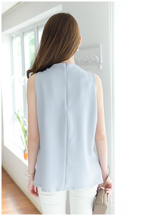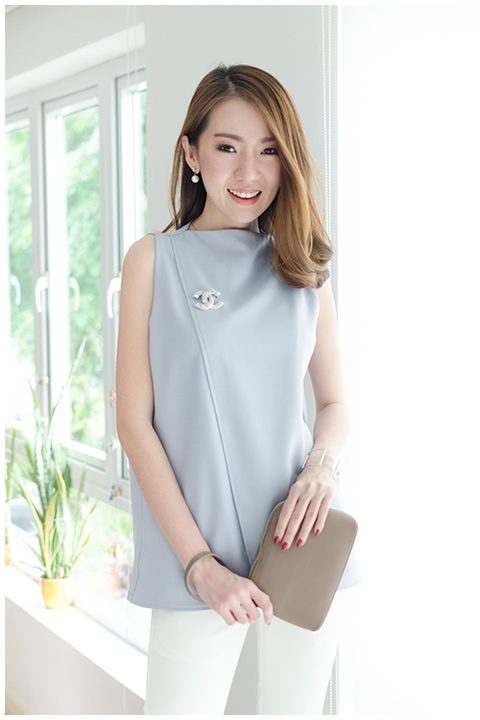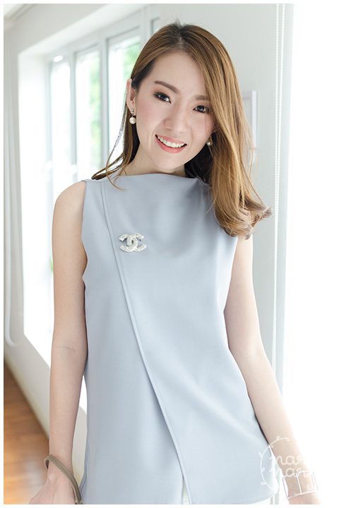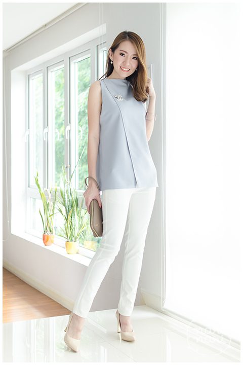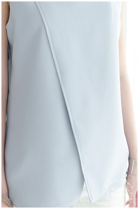 เสื้อแขนกุด สีขาว ดีไซน์คอปีนปาดๆ ด้านหน้าซ้อนไขว้เฉลียงเย็บปิดอย่างดี ผ่าชายเล็กน้อยด้านล่าง พอจะเก๋ ผ้ากาแล็คซี่ทอเนื้อแน่นๆ เป็นลายริ้วในตัว สวยมากๆ ใส่ขึ้นมาแล้วได้ลุคเฉี่ยวๆ สวยมีสไตล์มากค่า