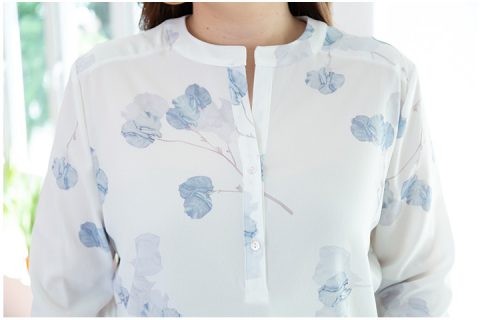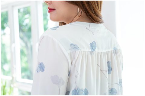 เสื้อแขนยาวผ้าโพลีเอสเตอร์เนื้อดีมากๆ นิ่มลื่น ทิ้งตัวมีน้ำหนัก สีขาวออฟไวท์ นวลๆ พิมพ์ลายกลีบดอกเฟื่องฟ้าสีฟ้าหม่นๆ สวยลงตัว ผ่ากระดุมหน้าครึ่งตัว แขนยาว ผ้าเนื้อดี ใส่สบายมากค่า