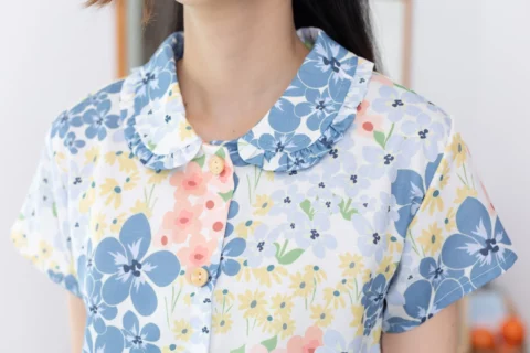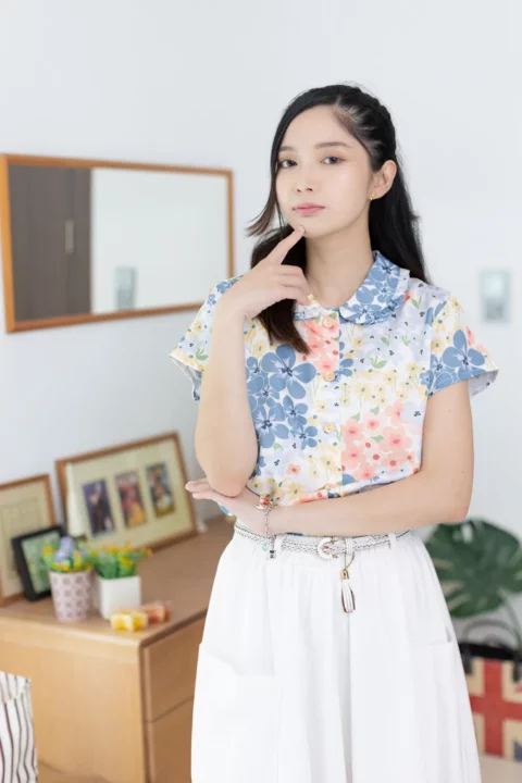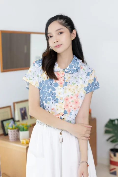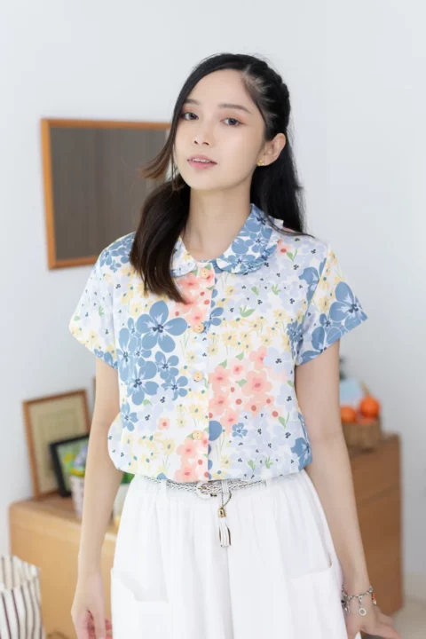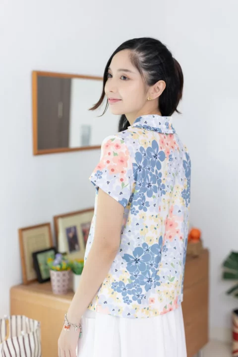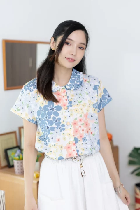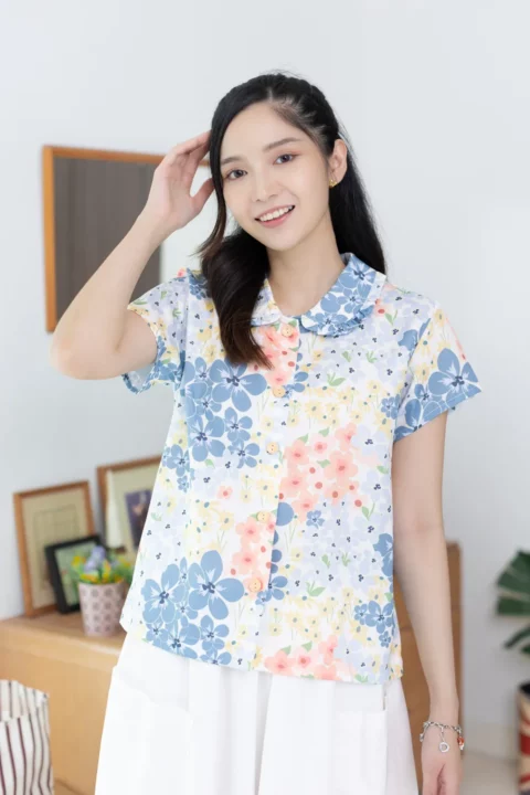 เชิ้ตแขนสั้นผ่าหน้า ทรงสบายๆ ปกบัวแต่งระบาย ทรงเสื้อไม่สั้นไม่ยาวใส่ปล่อยได้เลย ใช้กระดุมไม้ มู้ดชิลๆที่น่ารัก