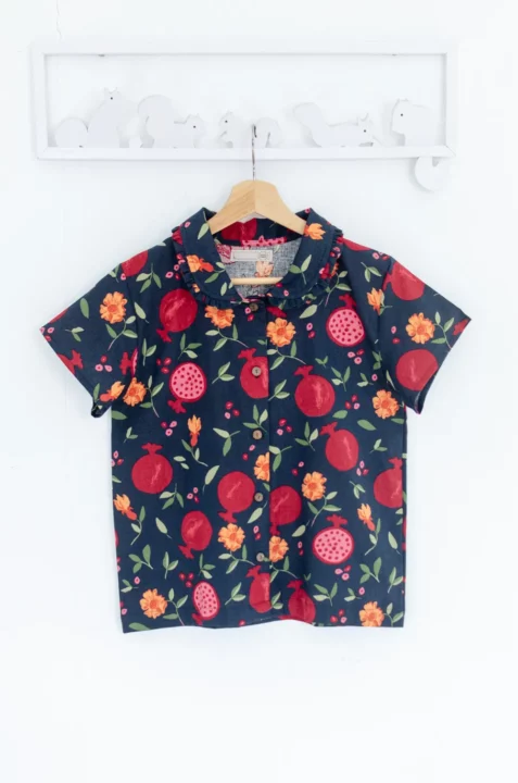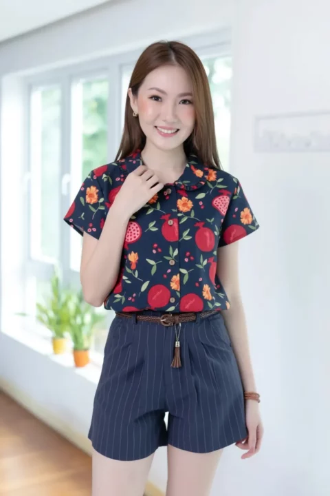เชิ้ตแขนสั้นผ่าหน้า ทรงสบายๆ ปกบัวแต่งระบาย ทรงเสื้อไม่สั้นไม่ยาวใส่ปล่อยได้เลย ใช้กระดุมไม้ มู้ดชิลๆที่น่ารัก