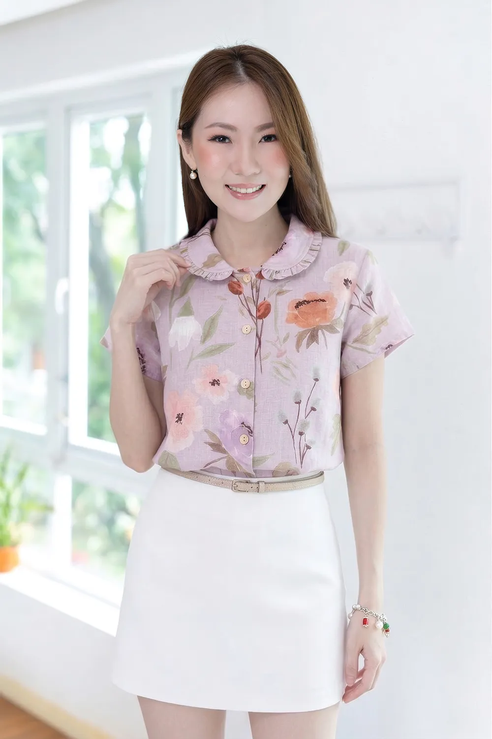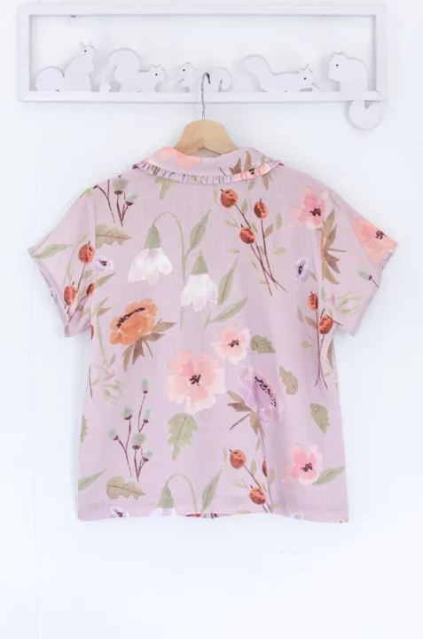 เชิ้ตแขนสั้นผ่าหน้า ทรงสบายๆ ปกบัวแต่งระบาย ทรงเสื้อไม่สั้นไม่ยาวใส่ปล่อยได้เลย ใช้กระดุมไม้ มู้ดชิลๆที่น่ารัก ลายนี้ตัดเย็บด้วยคอตตอนลินิน ผ้าไม่หนา มี Texture จากการทอ สวยเก๋ เหมาะกับวันหยุดเลย
