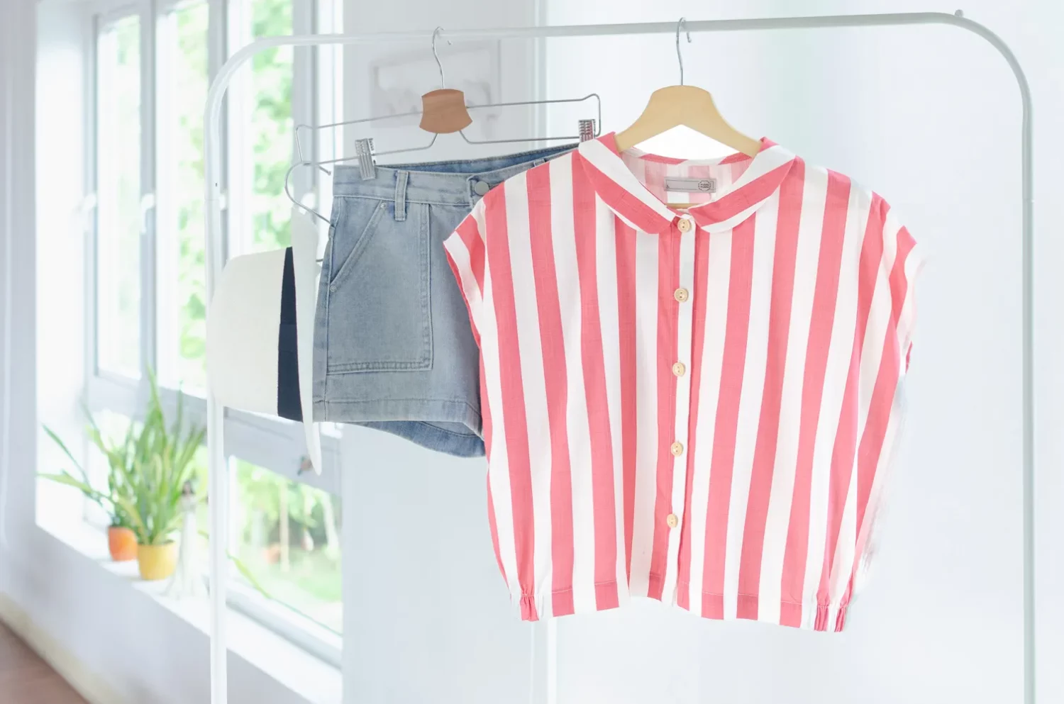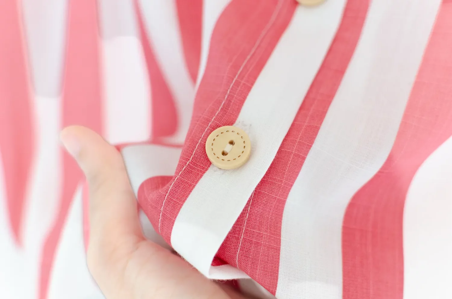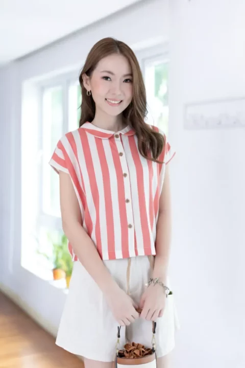 เสื้อคอปกกลม ทรงครอปสั้น ดูน่ารักและสดใส ผ่าหน้าติดกระดุมไม้ แขนปล่อยๆล้ำๆ ดูเรียบแต่มีสไตล์ ชายเสื้อแต่งรูดด้วยยางยืดด้านข้างช่วยให้ทรงอยู่ตัว เหมาะกับวันชิล เป็นรุ่นที่ใส่สบายแอบมีลูกเล่นเบาๆ