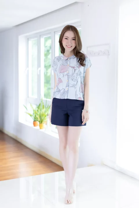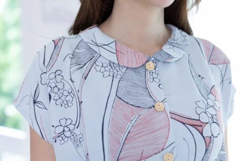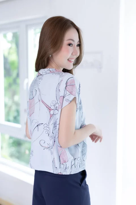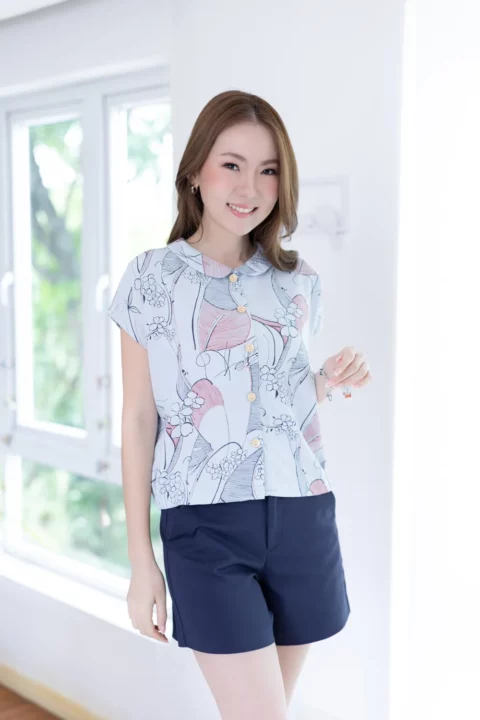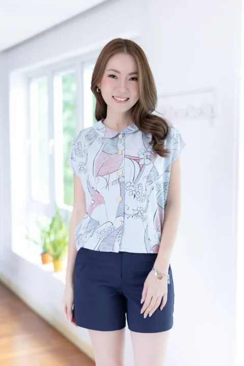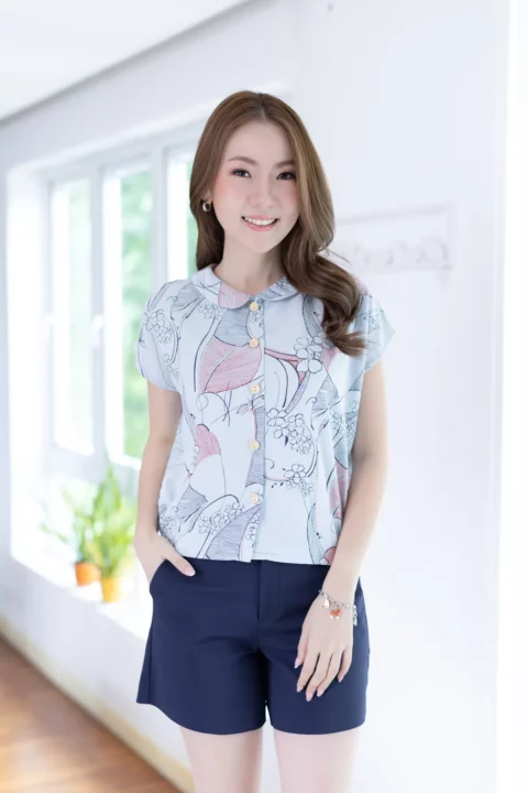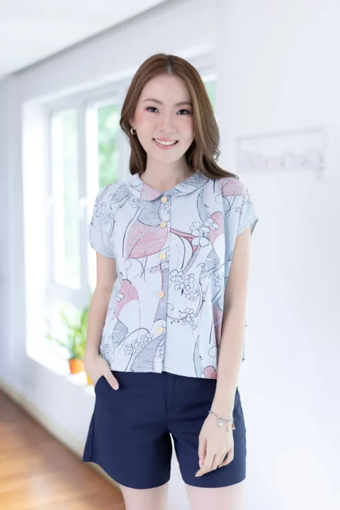 เสื้อคอปกกลม ทรงครอปสั้น ดูน่ารักและสดใส ผ่าหน้าติดกระดุมไม้ แขนปล่อยๆล้ำๆ ดูเรียบแต่มีสไตล์ ชายเสื้อแต่งรูดด้วยยางยืดด้านข้างช่วยให้ทรงอยู่ตัว เหมาะกับวันชิล เป็นรุ่นที่ใส่สบายแอบมีลูกเล่นเบาๆ