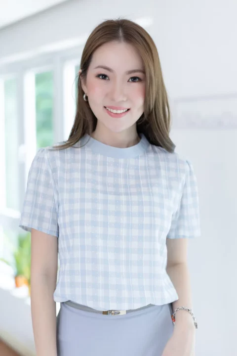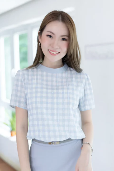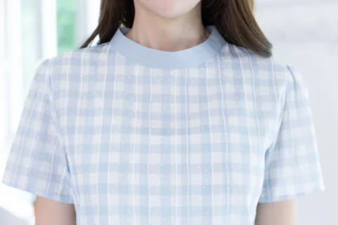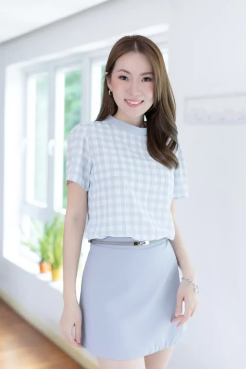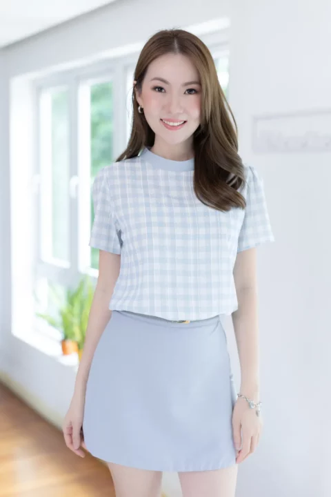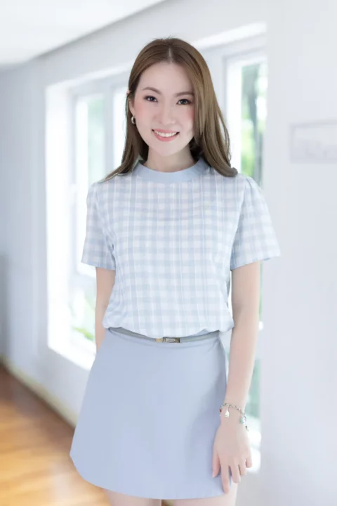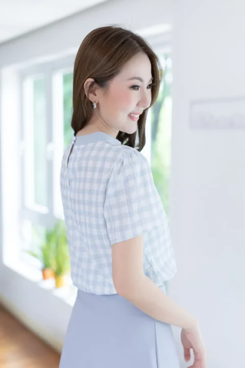 เสื้อคอปิด แขนสั้น ด้านหลังคอผ่าหยดน้ำติดกระดุม ตัดเย็บด้วยผ้าโพลีเอสเตอร์ผิวเนียน ฟีลโปร่งๆดูนุ่มๆ สกรีนลายจิ๋วๆบนผิวผ้า น่ารักมากก